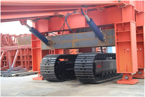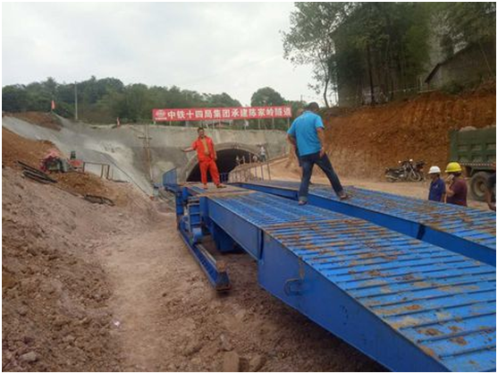 棧橋平移時,收起棧橋行走支架,將棧橋前后兩端支架支撐在地面上,放下行走支架,使前端支架脫離地面,控制前后端支架中的平移油缸,使棧橋橋身整體左右平移,把前后棧橋放置在地面上,運輸車輛即可在棧橋上通行,在棧橋下方進行仰拱的施工。由于主橋的跨度大可以同時進行仰拱的開挖和仰拱回填施工,出渣等。棧橋前進時,放下行走支架和后段行走驅動裝置,使前后端支架脫離地面,開動行走驅動馬達,使棧橋整體向前方移動到預定位置,行走驅動裝置采用橡膠輪胎行走,無需鋪設鋼軌,可適用于各種開挖方式和不同工況,并且可以隨時自由轉換,操作簡單、靈活,使用面極其廣泛。
